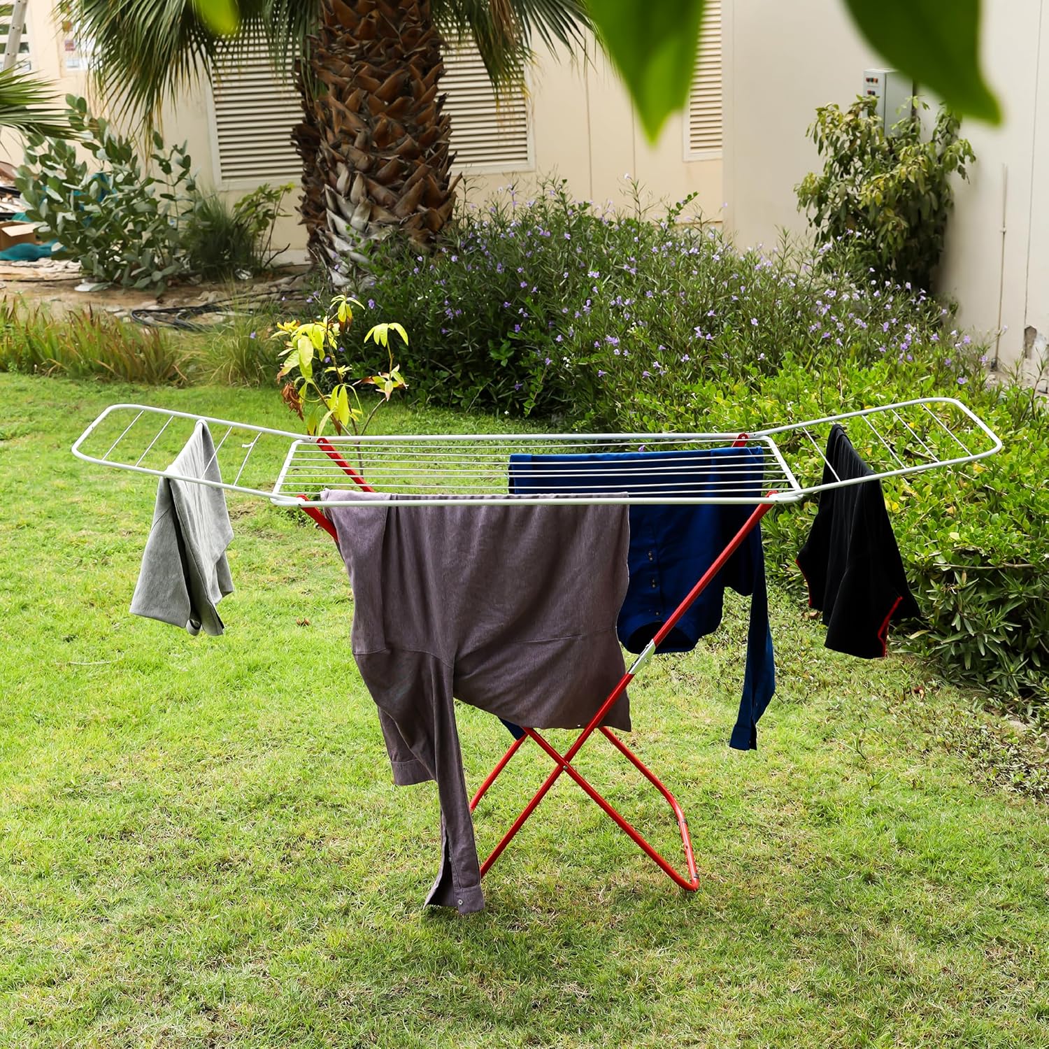 Estructura Resistente y Ligera Material: Acero Color de estructura: Blanco y rojo, con rejilla blanca para colgado Diseño plegable: Fácil de guardar y trasladar Medidas 1,80m de largo x 50cm de ancho x 1,05m de alto (abierto)