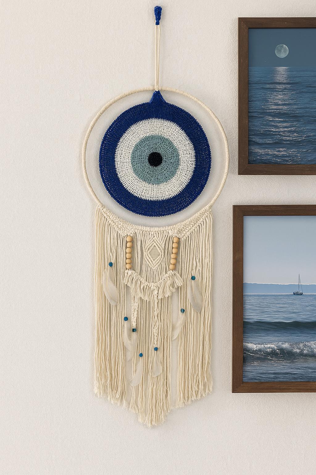Atrapasueños Con Flecos Color: beige Medida: 90cm de alto x 40 cm de diámetro Diseño: ojo turco tejido a mano Ideal para decorar y proteger tus espacios con estilo y significado.
