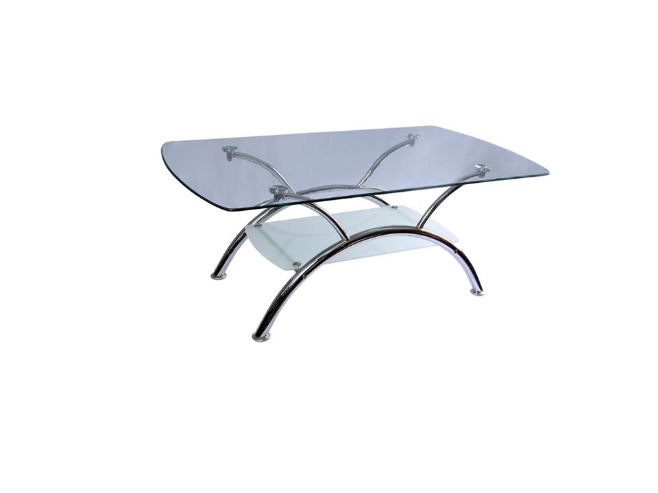 Mesa de living de vidrio y patas cromadas.